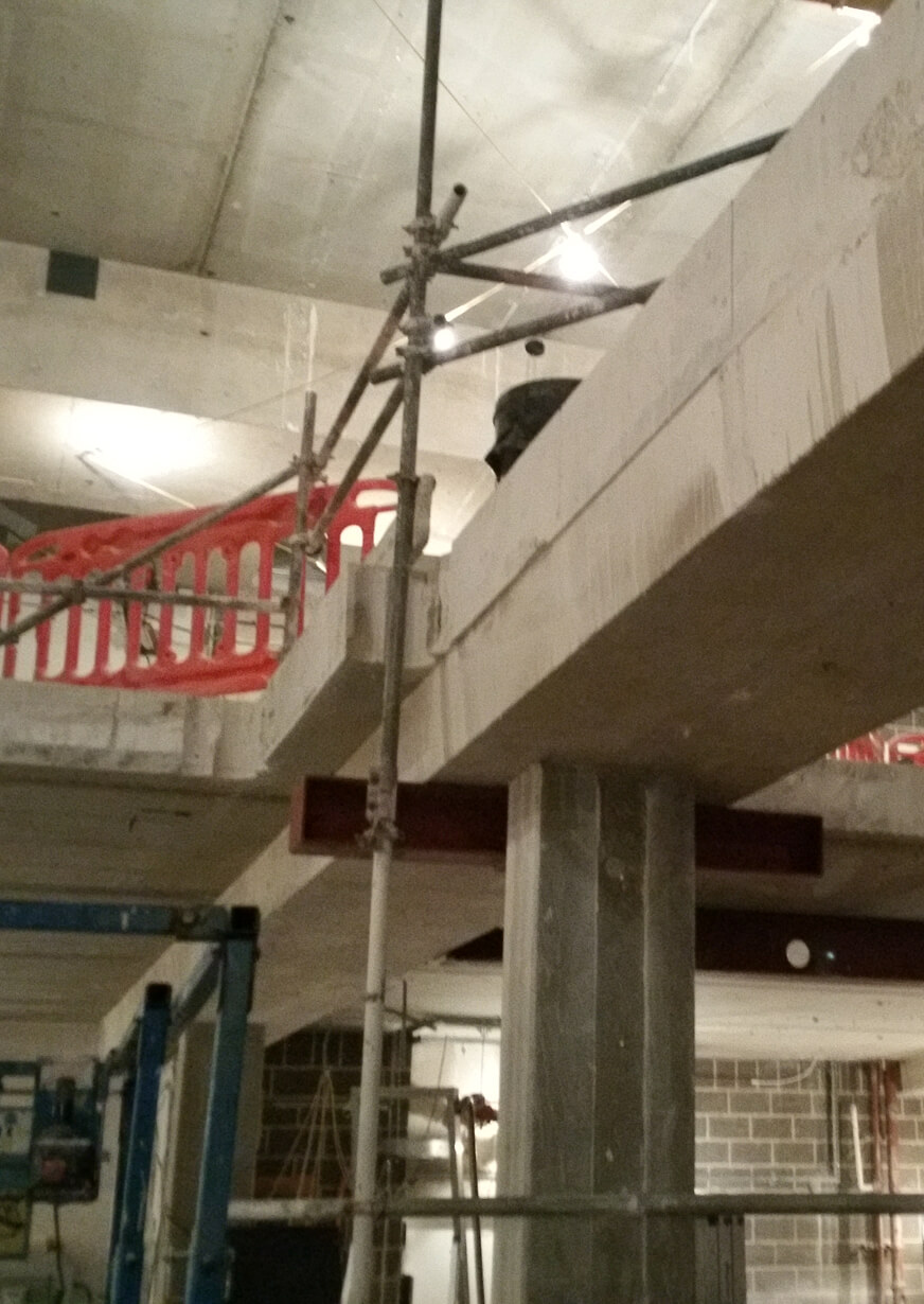 Modifications to existing post-tensioned slabs created a dramatic open entrance area.